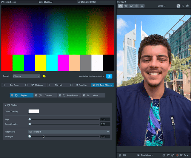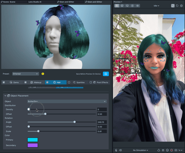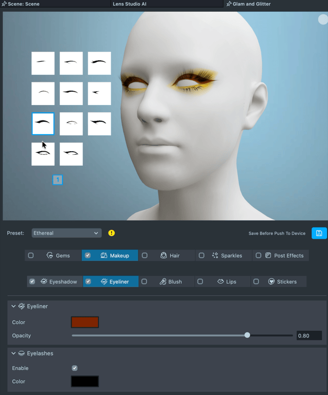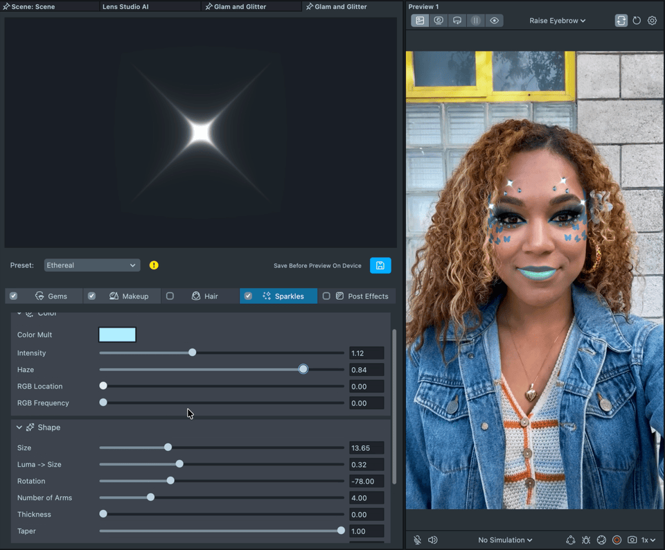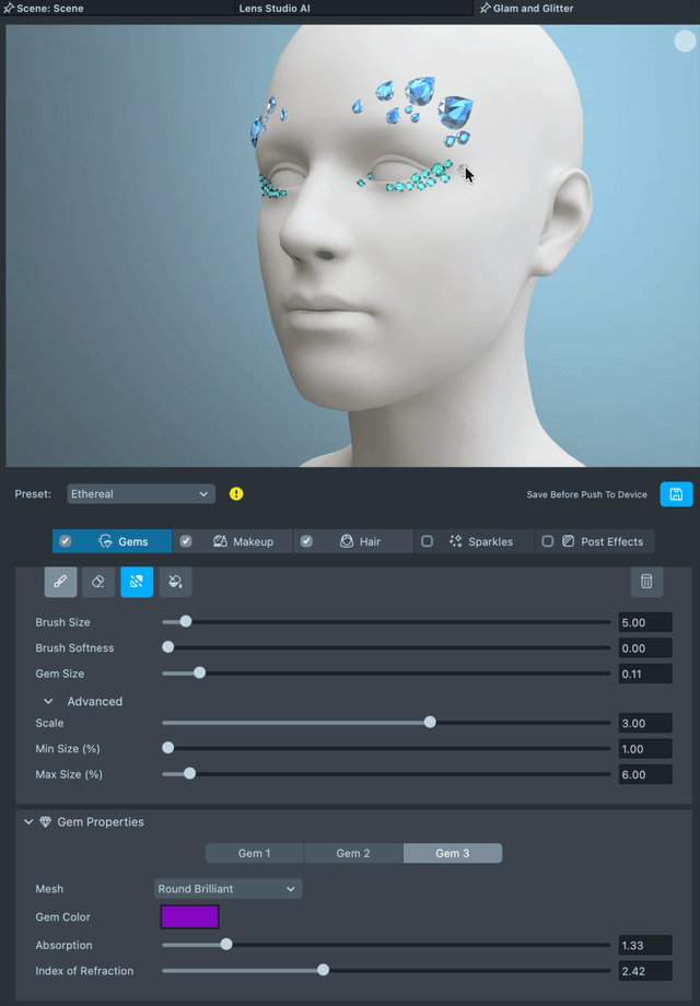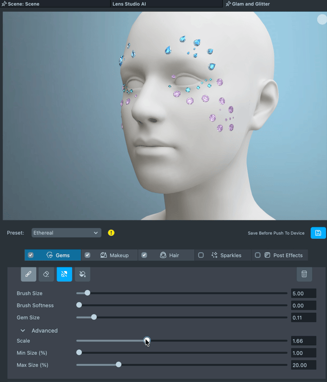 + Create Newbutton to add the Glam & Glitter component to your scene. - Play around! Edit the Gems, Makeup, Hair, Sparkles, and Post Effects.