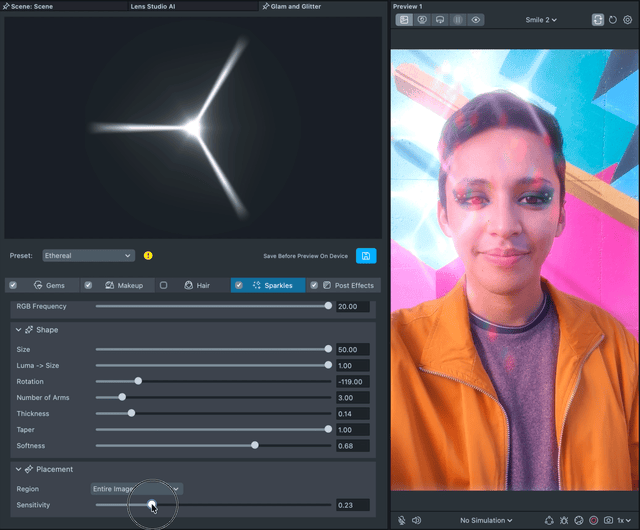 Control the shape, size, color, and intensity of sparkles. You can adjust the distribution to place sparkles on just gems or apply them to the entire lens.