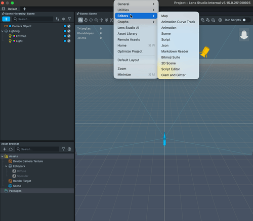 Window > Editors > Glam & Glitter).If you already have a Glam & Glitter component in your scene, you can double click it to launch the plugin.