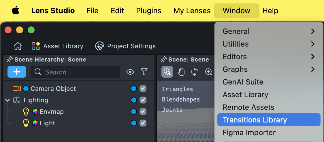 Transitions Librarypanel by navigating toWindow -> Transitions Libraryin the top menu bar.