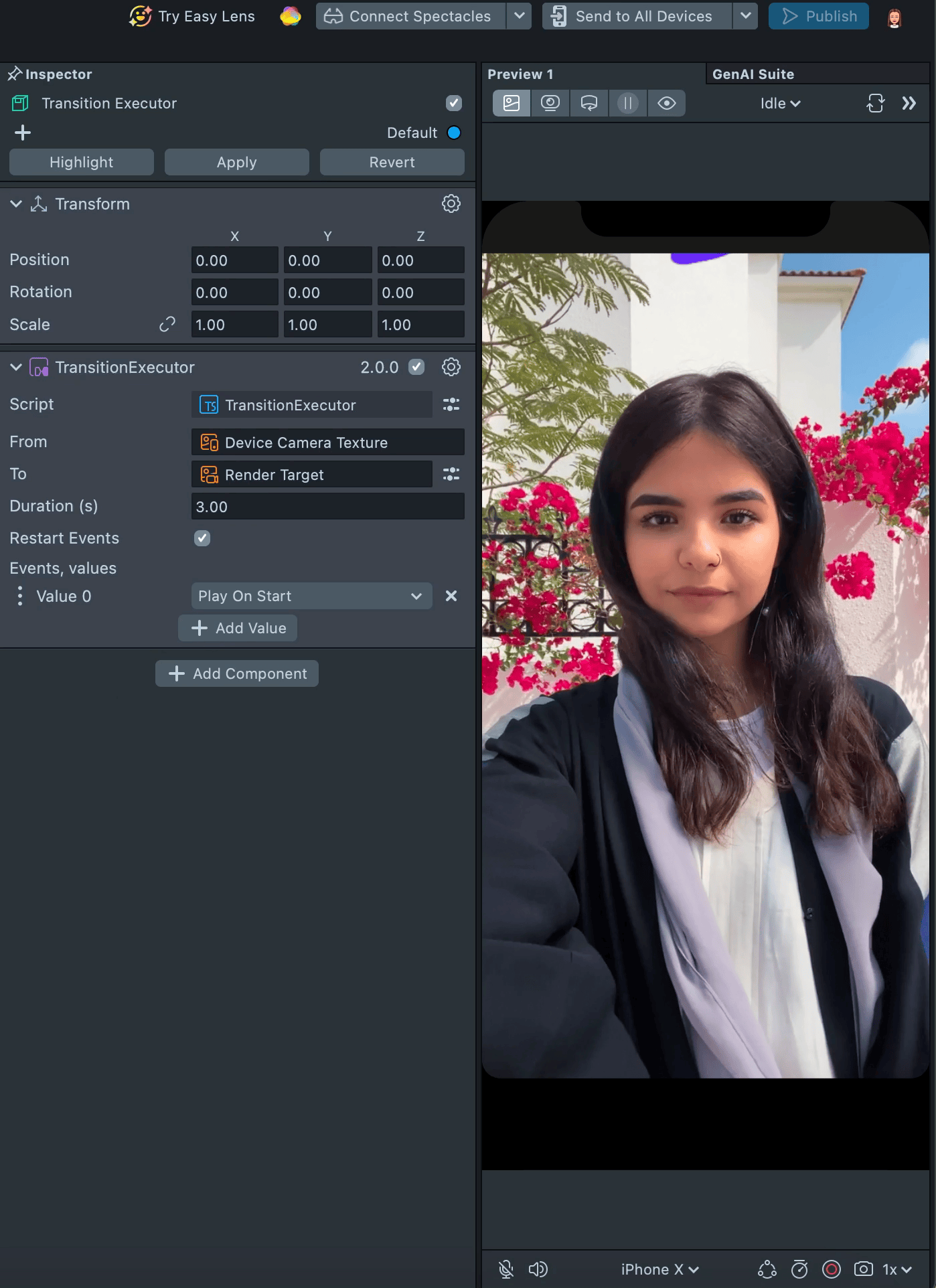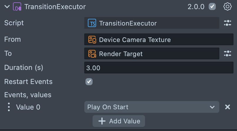 Transition Executorscript to select events during which the transition restarts and reverts to the previous state. Additionally, you can trigger it through code using theplay()method of the custom componentTransition Executor.
