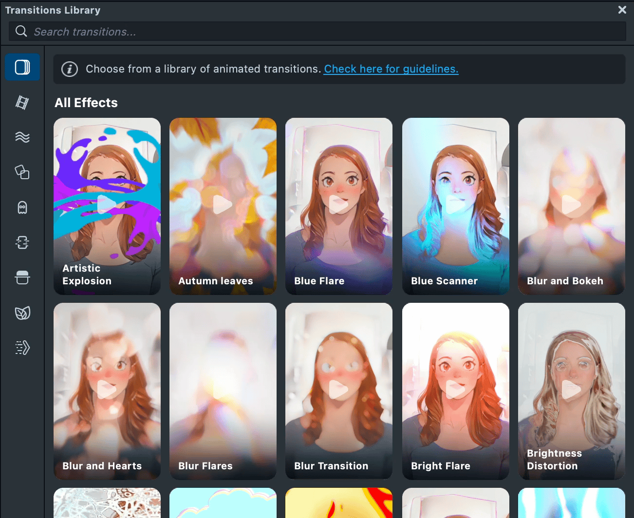 - Initially, a page with all the transitions will be visible. You can also use the menu on the left to navigate through the following categories: