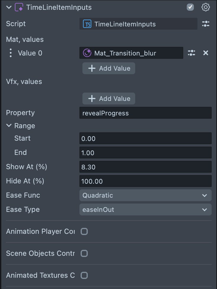 Importbutton, a prefab of the selected transition will be added to the scene. No additional setup is needed. The added transition immediately has the necessary parameters for render targets and scripts required for its execution.