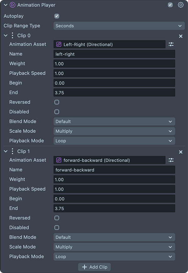 By default, Animation Player will play the animations automatically. However, you may want to manually trigger the animation, or switch between animations. In addition, when useful, you can blend between animation clips.