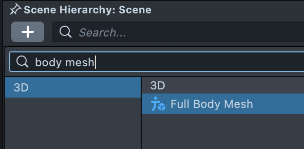 To add a Body Mesh to your Lens Studio project, first go to the Scene Hierarchy panel, and press the + button. Then select the Full Body Mesh.