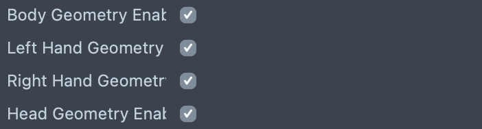 Enabling or disabling the Hands, Body and Head checkboxes on the Full Body Mesh asset allows you to decide what parts of the body to include in your body mesh.
