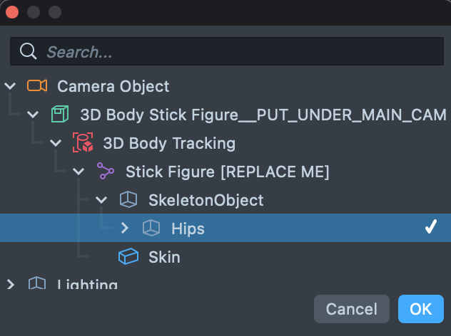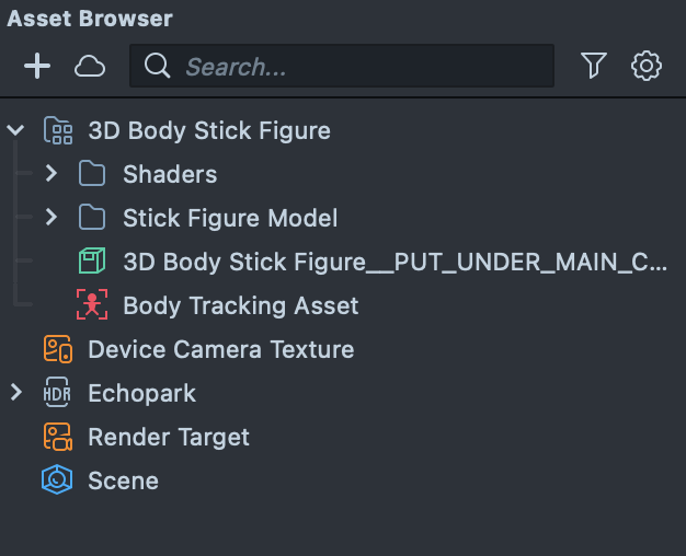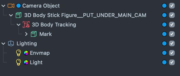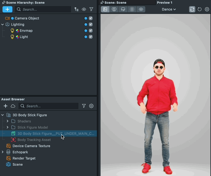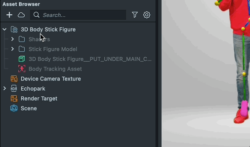 The 3D Body Stick Figure, 3D Body Dancing Mark, and 3D Body Two Spacesuits assets have a 3D model rigged to a skeleton that matches what the tracker sees. This allows the Lens to map the movement of the body to the movement of the model. In the last asset, the 3D Body Abstract Gear, we have individual objects attached to individual joints of the body.