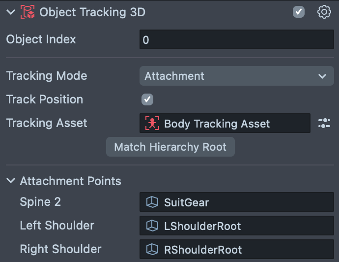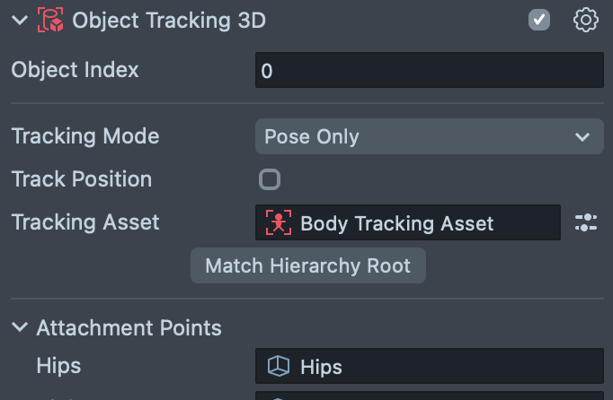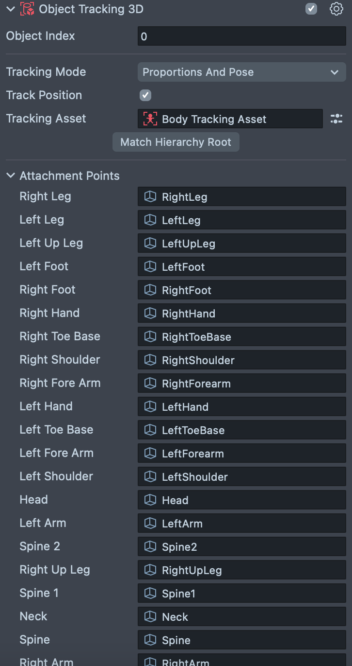 In the Inspector Panel, you'll see that this object has an Object Tracking 3D component which has a mapping of the model's joint to the trackers.