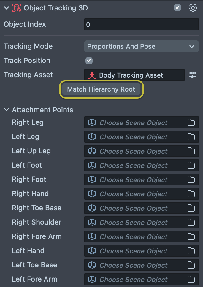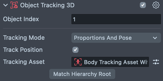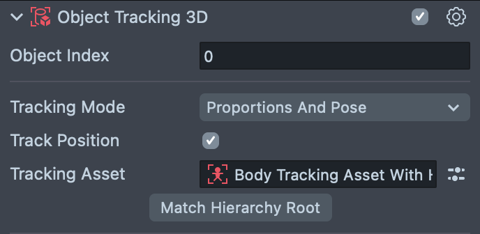 With your model placed under the 3D Body Tracking scene object, you can select the object and link the joints of our character to the joints of the body. To do this, in the Inspector Panel, press the Match Hierarchy button.