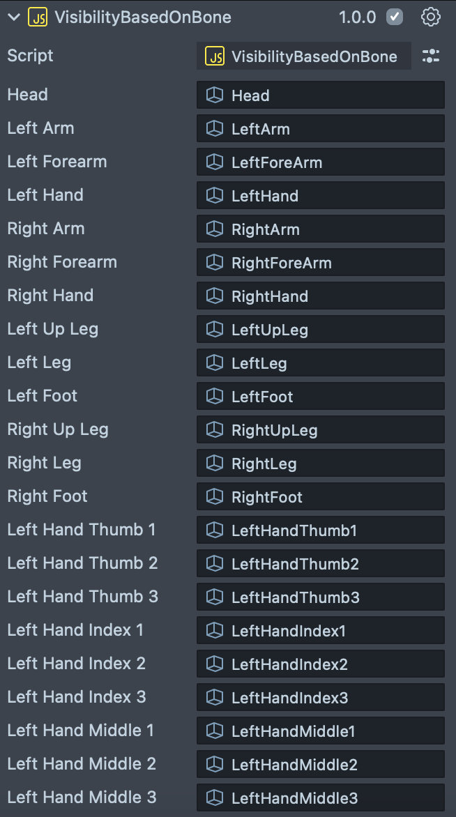 However, if you have the mesh in its separate group and not referenced by the Object Tracking 3D Component, you will need a simple script that will disable the pieces of the mesh if the corresponding joint is disabled. You can see an example of that script attached to the 3D Body Tracking scene objects in the Spacesuit scene object hierarchy.