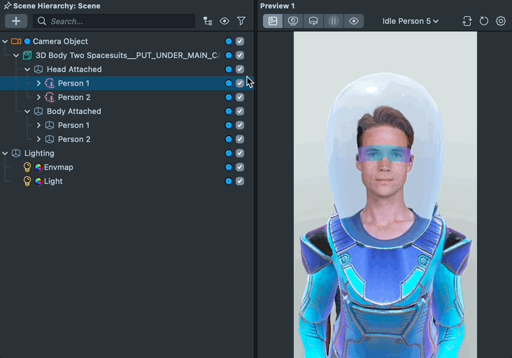 You can also use 3D Body Tracking to apply 3D models as a suit on a person rather than as a separate character. Let's take a look at the 3D Body Two Spacesuits asset to see an example of this.