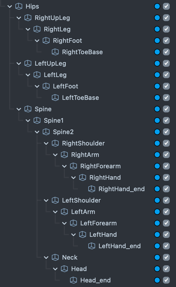 Optionally, the 3D Body tracker can also track joints in the user's hand. A standard rigging hierarchy is added to support movement in the hands: