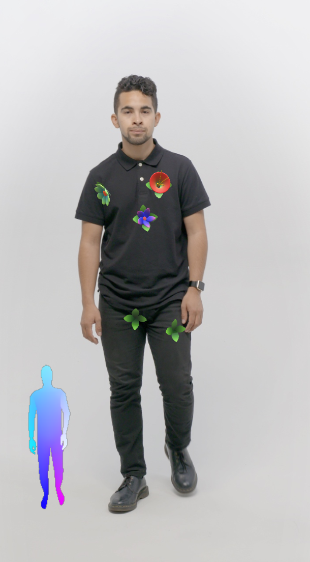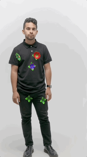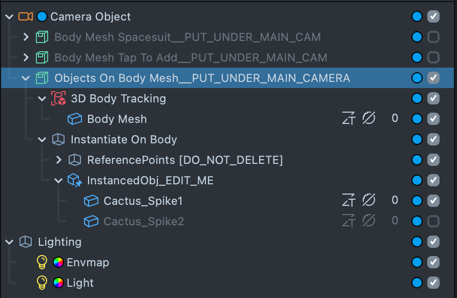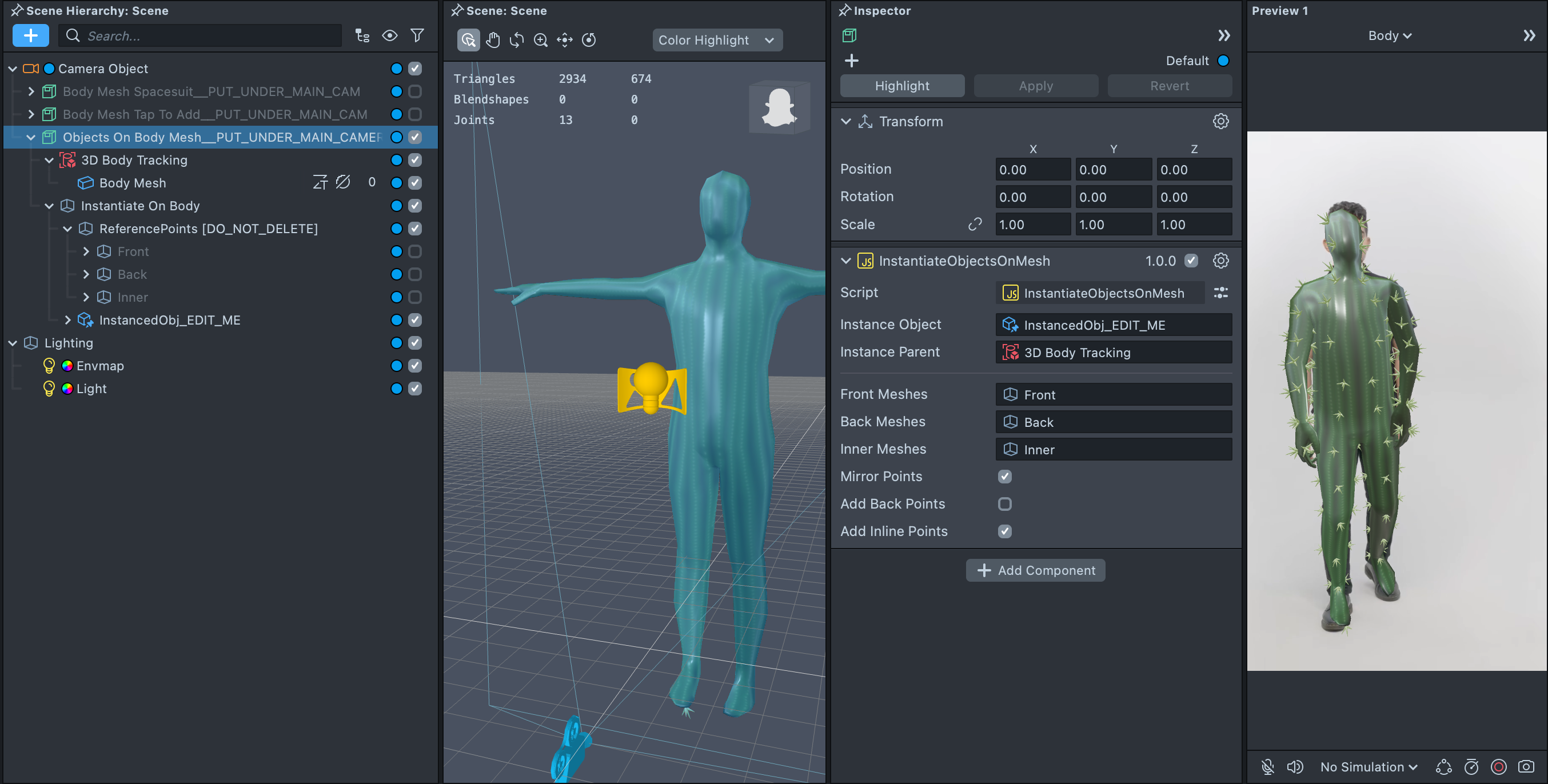 The Body Mesh feature allows you to apply effects to the body that automatically fits the Snapchatter. The assets comes with both an example of applying textures to a Body Mesh, as well as using the body mesh as placeholders to drive effects, such as tapping to instantiate on parts of the body.
