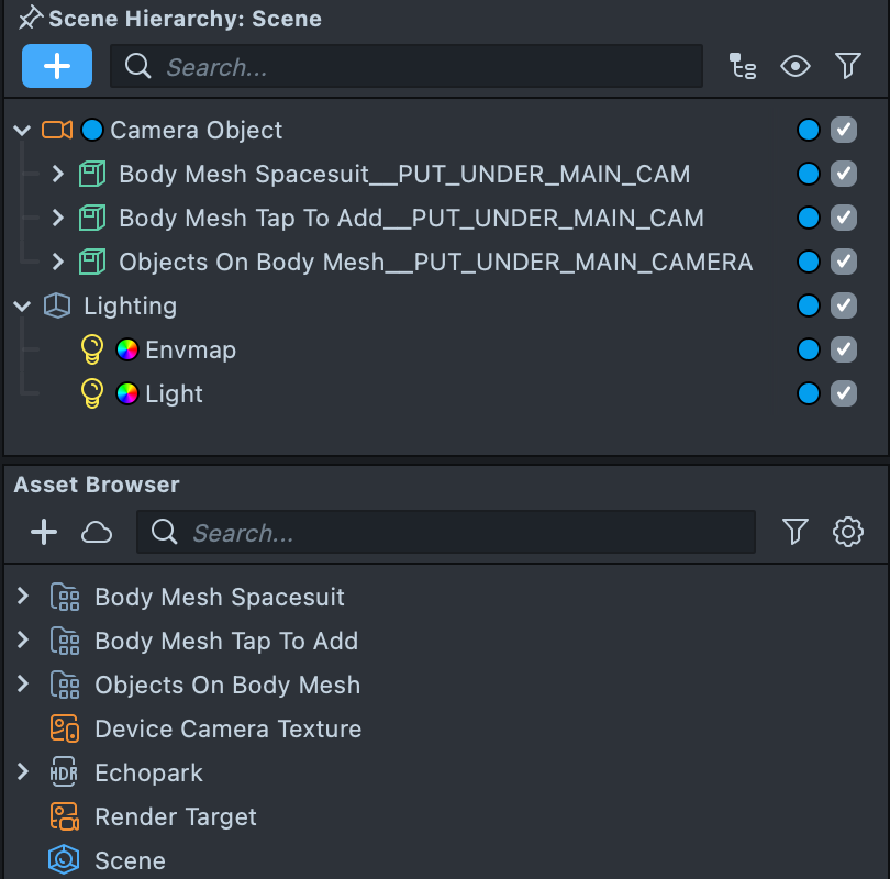 Find the Body Mesh Spacesuit, Body Mesh Tap To Add and Objects On Body Mesh asset in the Asset Library and import it into your project. Click here to learn more about how to use assets in the Asset Library. Once you import the asset from Asset Library, you can find the package in the Asset Browser. Follow the instructions and drag the prefab with PUT_UNDER_MAIN_CAMERA tag into Scene Hierarchy under Camera Object to create a new Scene Object. You can right-click and select Unpack for Editing from the drop-down menu to unpack all assets stored in the bundle. Click here to learn more about Asset Packages. Once you unpack the package, you can then edit its content.