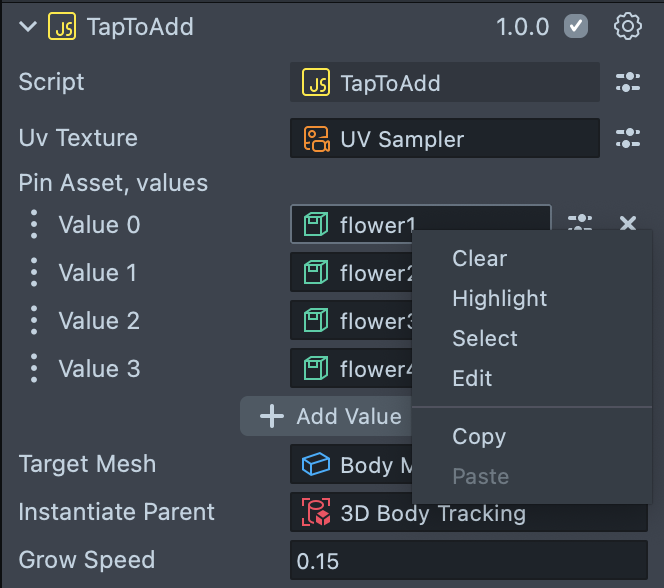 Right click to highlight the flower prefabs and you’ll see each of them have a PinToMesh component. The script will set their target to the TargetMesh variable (in this case it is the Body Mesh object) and set the pinned position to converted UV position on tap.