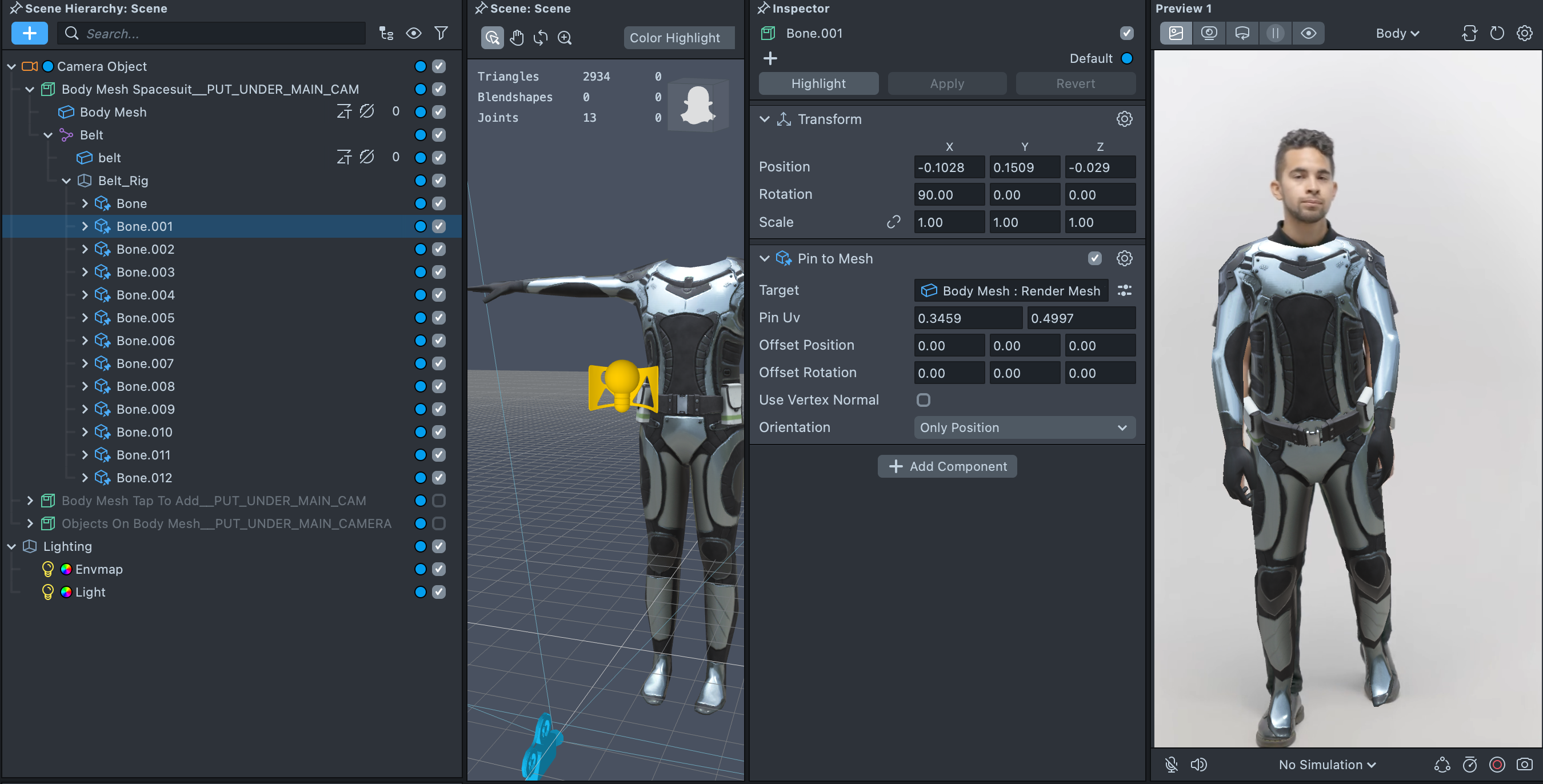 The Objects On Body Mesh asset allows you to spawn instances of objects along the body based on predetermined UV positions with PinToMesh.