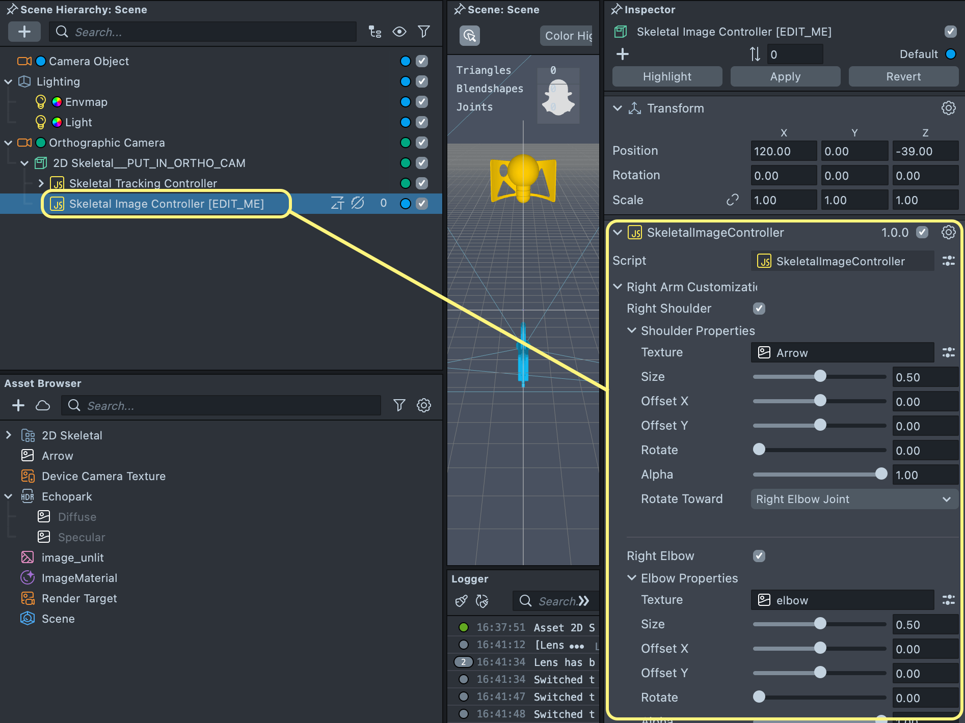 First, select the Skeletal Image Controller [EDIT_ME] object in the Scene Hierarchy panel to see its settings in the Inspector panel.