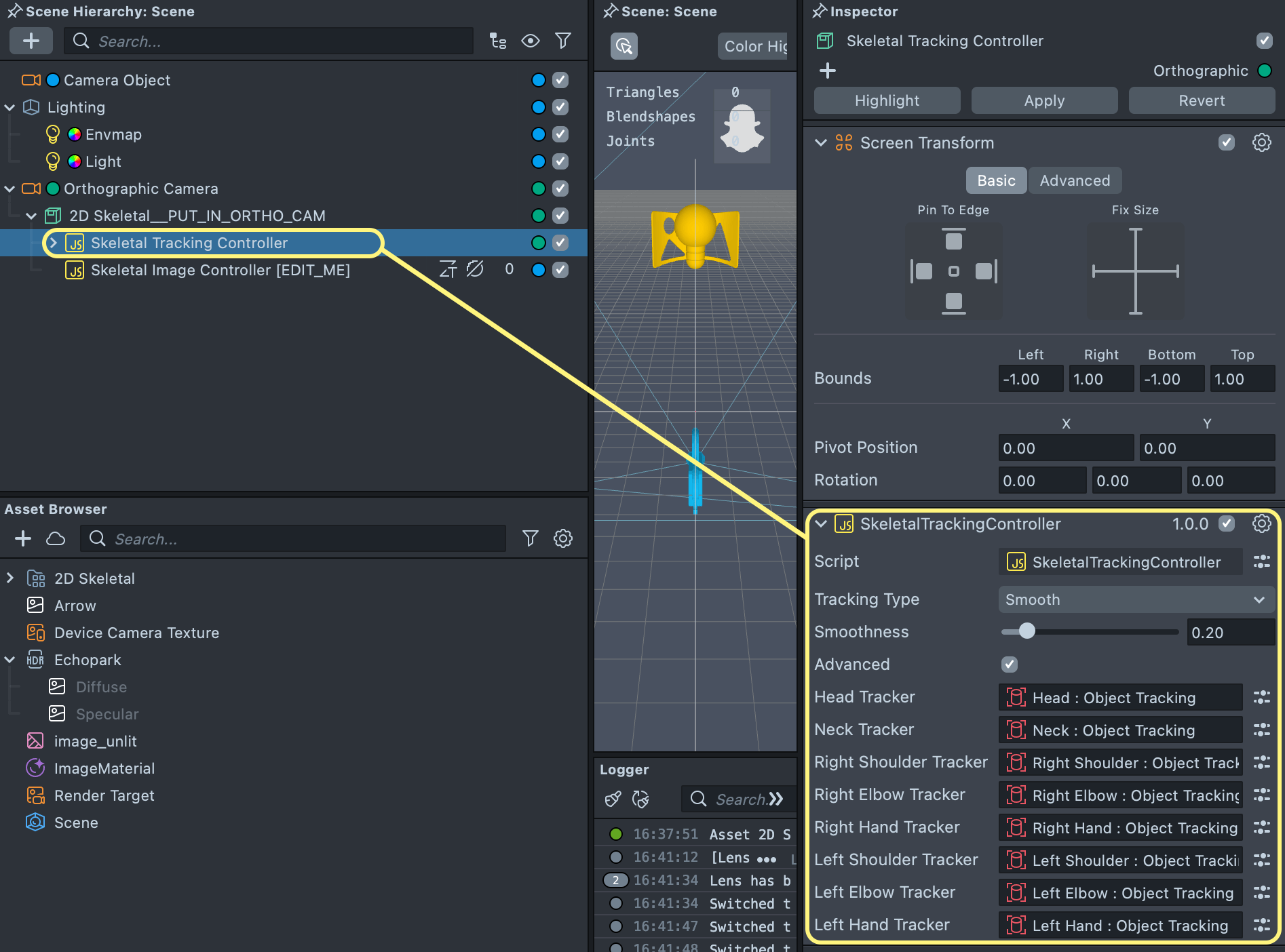 By default, the tracking type is set to Smooth. To change the tracking type, select the Skeletal Tracking Controller in the Scene Hierarchy panel under the Orthographic Camera object.