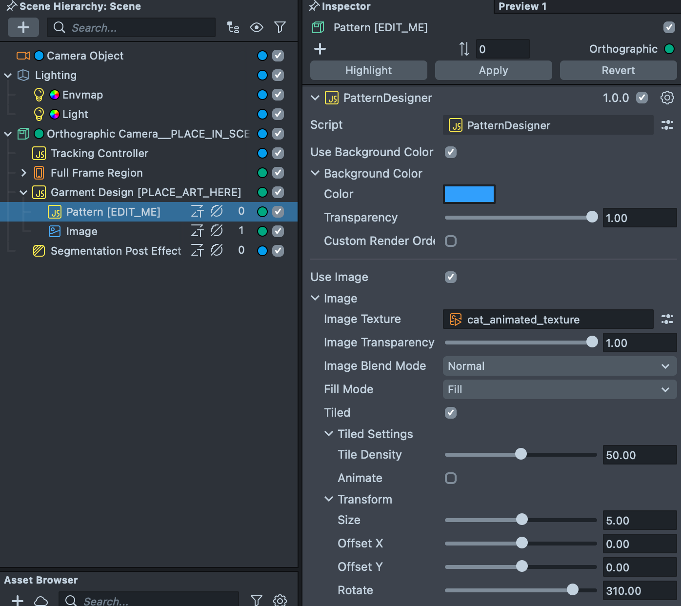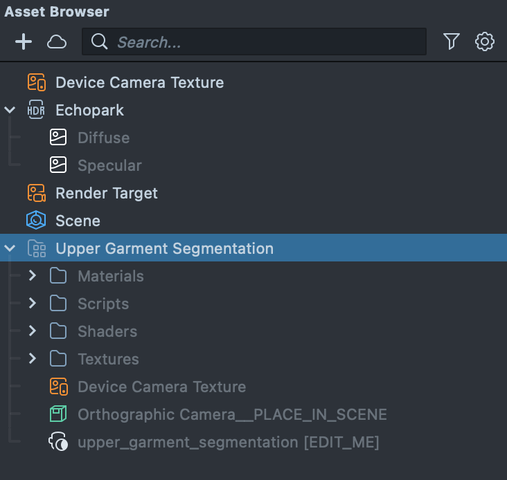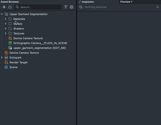 To modify what part of the image is segmented, modify the segmentation texture resource found in the Asset Browser panel. To do this, select the upper_garment_segmentation [EDIT_ME] object, and in the Inspector panel, modify its settings.