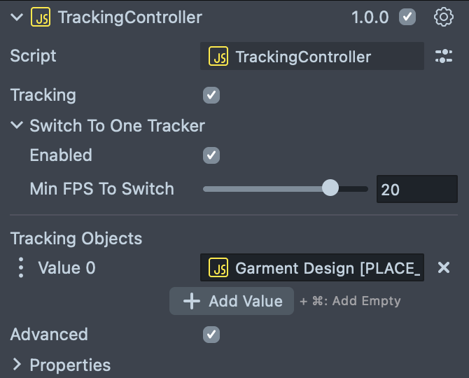 This script helps you to track all your objects on the garment. To modify it settings first select the Tracking Controller under the Orthographic Camera in the Scene Hierarchy panel and modify the values in the Inspector panel.