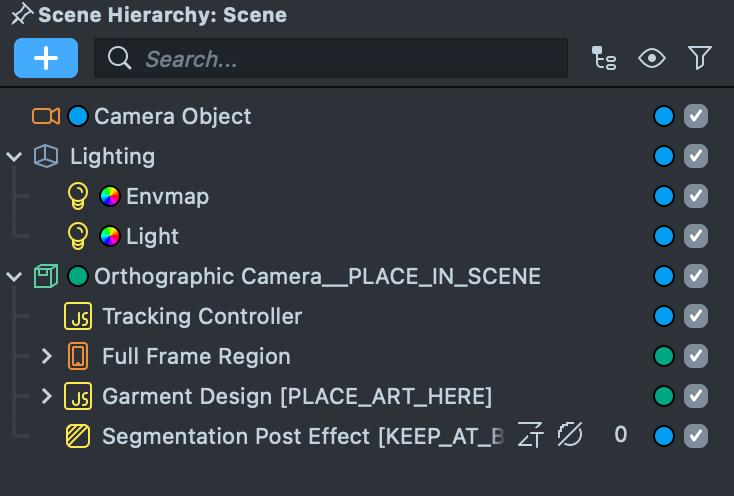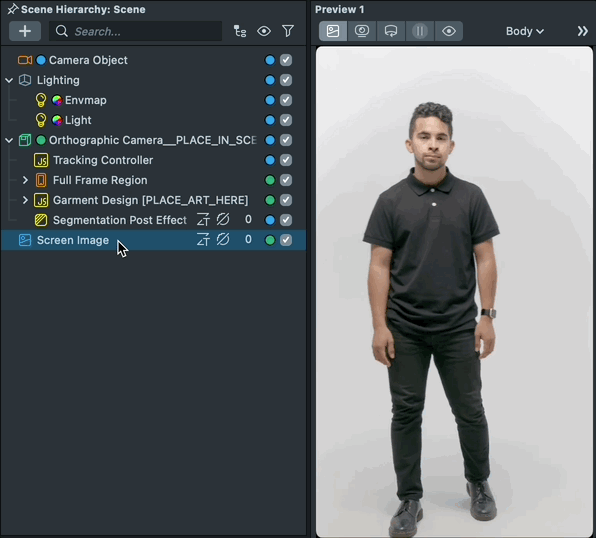 You can select and specify what objects are tracked to the body using the Tracking Objects. The Garment Design [PLACE_ART_HERE] object is already set as a tracking object to make the process easier.