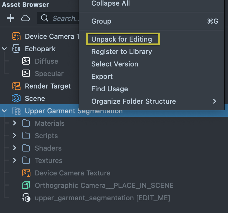 You can right-click and select Unpack for Editing from the drop-down menu to unpack all assets stored in the bundle. Click here to learn more about Asset Packages. Once you unpack the package, you can then edit its content.