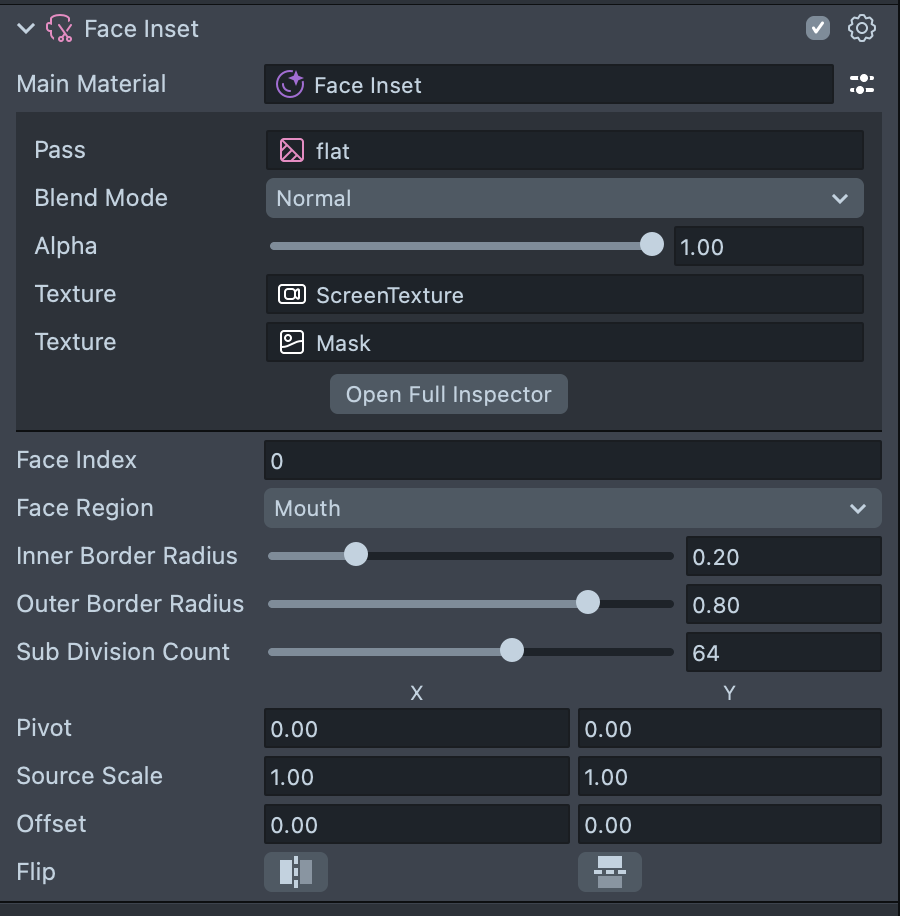 With the Face Inset object selected, you'll see the following settings used to configure the object in the Inspector panel:
