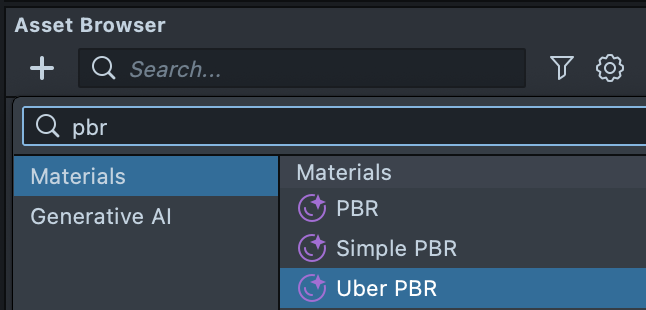 To create a PBR material, in the Asset Browser panel, press + > Uber PBR.