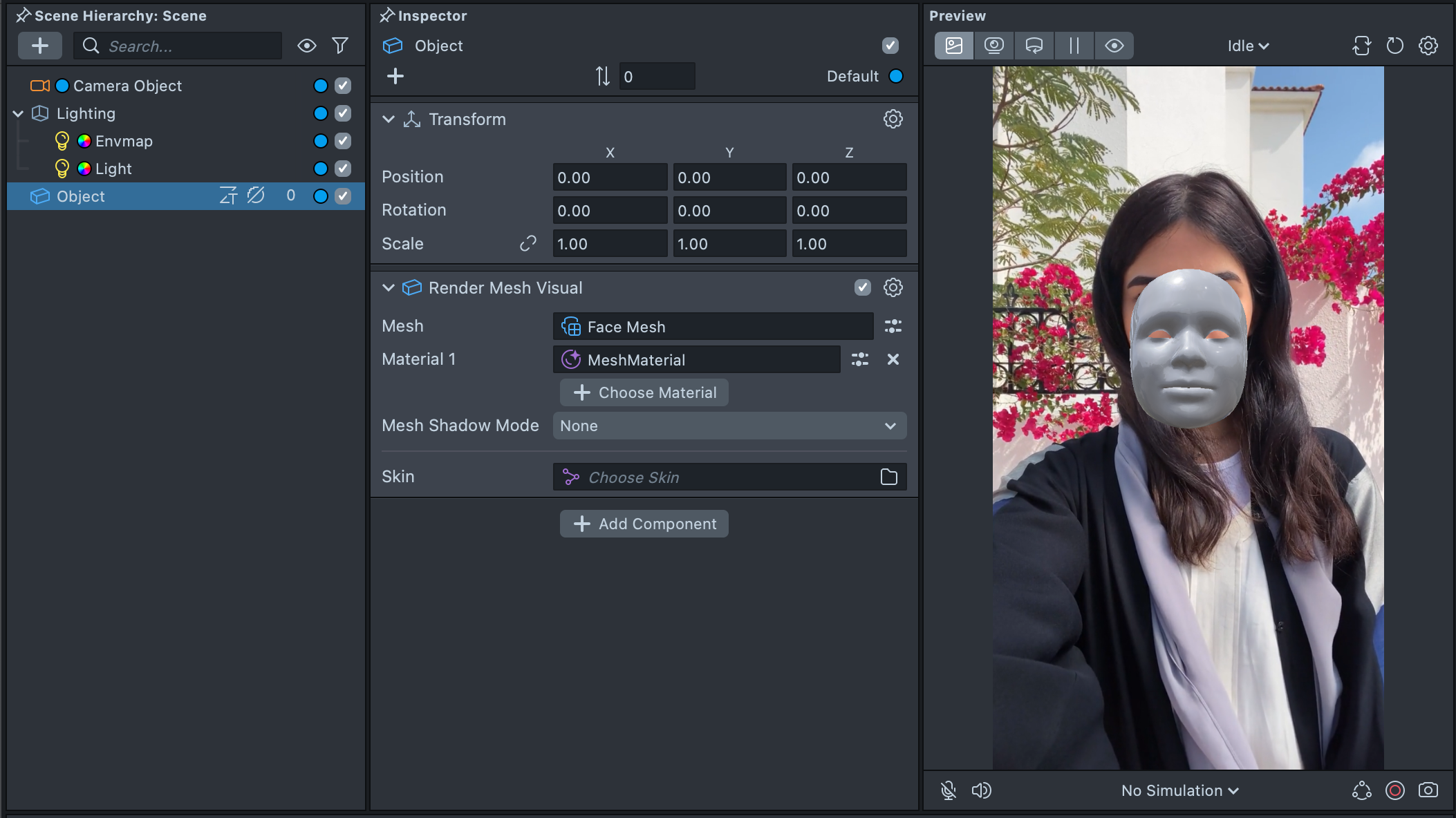 The Face Mesh resource provides a 3D mesh that will mimic the user’s facial expression in real time. It can be used anywhere a mesh may be used. For example, you can use the Head Binding component and the Face Mesh resource to add a 3D face mask on the user. Take a look at the Face Mesh Template for examples on how to use Face Mesh.