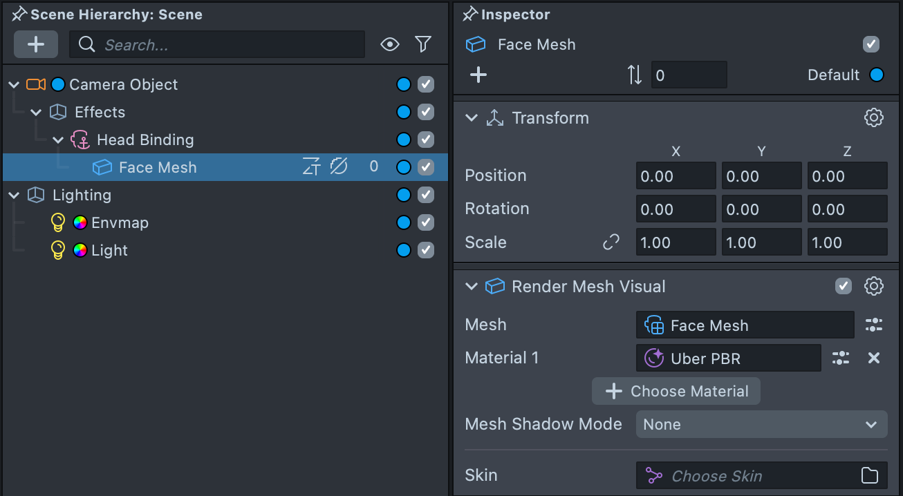 You can automatically add a Face Mesh to a user's head by clicking + > Face Mesh in the Scene Hierarchy panel.