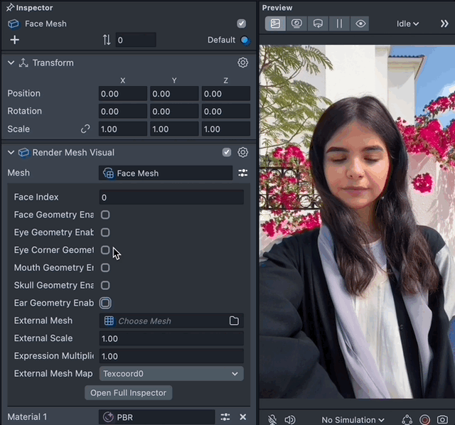 To change the setting of the Face Mesh, select the Face Mesh resource in the Asset Browser panel, and adjust its settings in the Inspector panel.