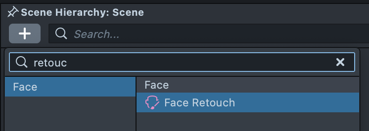 To create a Face Retouch effect, first click the "+" button in the Scene Hierarchy panel. Then, select Face Retouch. Once added, you should see a new Face Retouch object in your Scene Hierarchy panel.