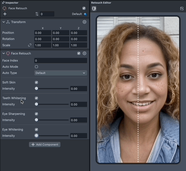 The Face Retouch object offers a number of features to retouch the user's face. These features include Soft Skin, Teeth Whitening, Eye Sharpening and Eye Whitening. In addition, the component provides an ML Retouch option automatically uses ML to add a subtle retouch effect.