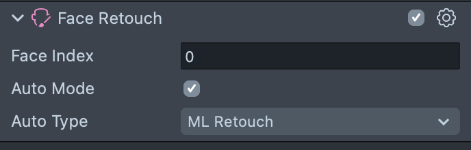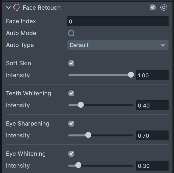 Select the Face Retouch object and configure it in the Inspector panel. Each Retouch feature has an Enabled boolean, which when checked enables the effect. Additionally, each feature has an Intensity slider, which determines how intense the effect is when applied to the face. Try to use low intensities to produce a more subtle effect.