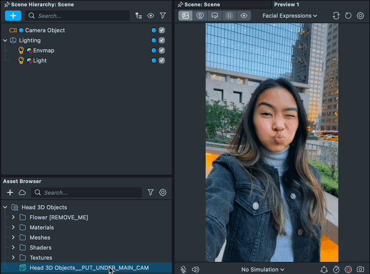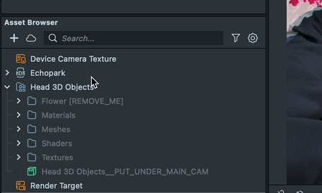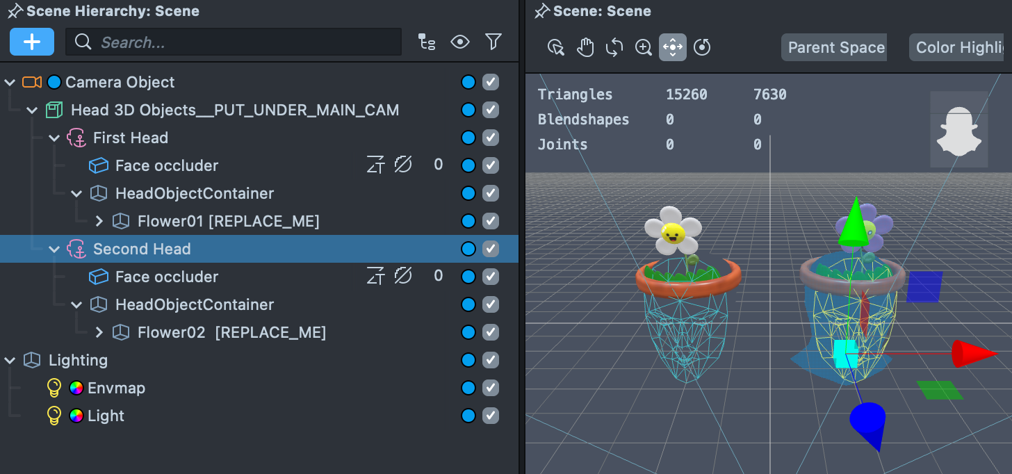 To add 3D objects to the second head, repeat the same process as above, but place it under the FaceObjectContainer below the Second Head. The Lens will automatically show and hide the object as needed depending on the number of heads visible.
