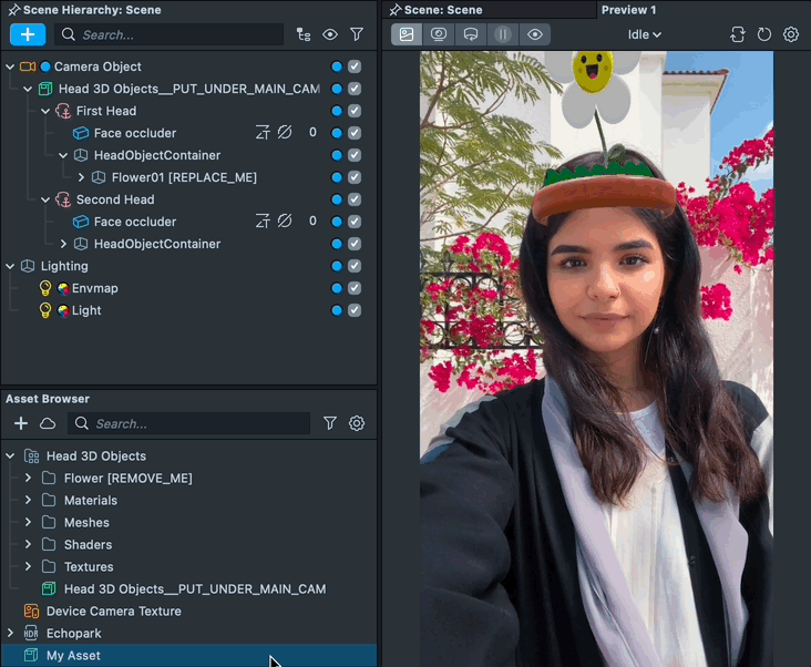 After importing, the 3D object will be automatically included in the Scene Hierarchy panel and should also be visible in the Scene panel. Drag your newly imported object to be a child of the HeadObjectContainer scene object found under First Head. This will attach the object to the first head found in the camera. You can now delete the asset's placeholder content labeled with [REPLACE_ME].