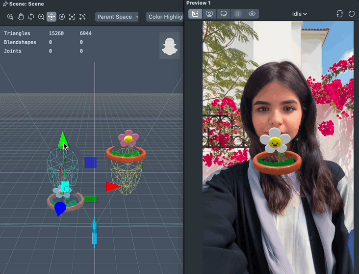 In the Scene panel, you can position, scale, rotate the world object relative to the head. In the Lens, the head object will automatically be locked to the head as shown in the Preview Panel.