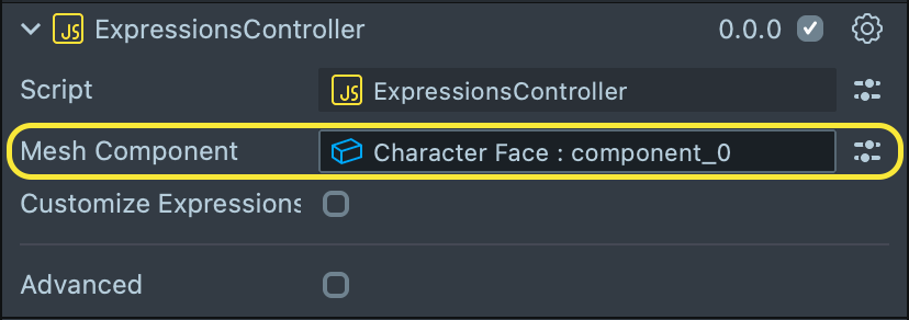 To hook your model up, select the Mesh Component field, and choose the Render Mesh Visual component on your object. At this point, if the blendshapes on your object matches those listed in the API page, your model will automatically be driven by the Face Expression feature.