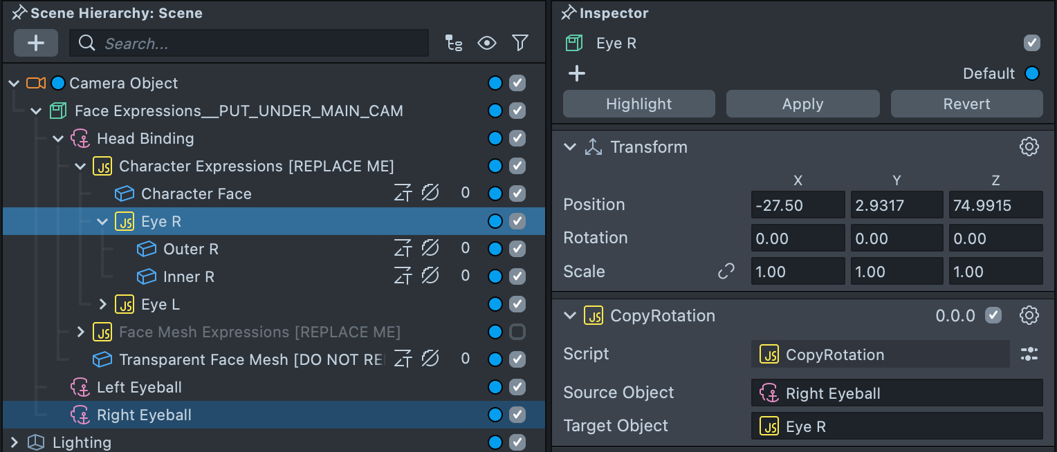 To use this helper script, add the Copy Rotation script to your eye object. Then, set the corresponding Eyeballs to the Source Object, and your model’s eye object to the Target Object.