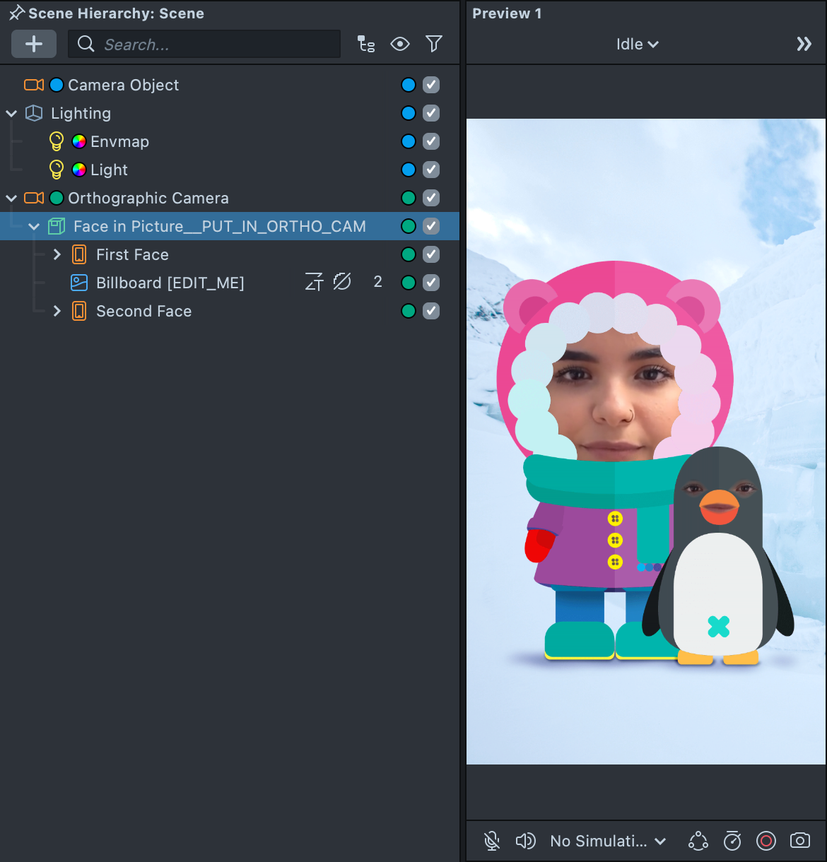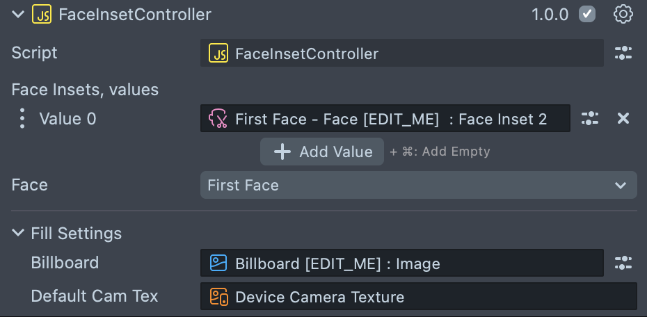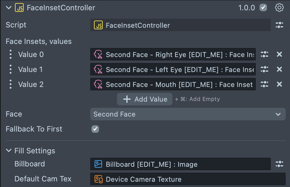 The asset includes a script called FaceInsetController which allows you to easily manage multiple faces. The script takes in a list of Face Inset objects. Then, a simple dropdown allows you to assign the inputted objects to the first or second face. Additionally, this script intelligently maintains the positions of the face insets in relation to the Screen Image when the Lens is used on different device resolutions.