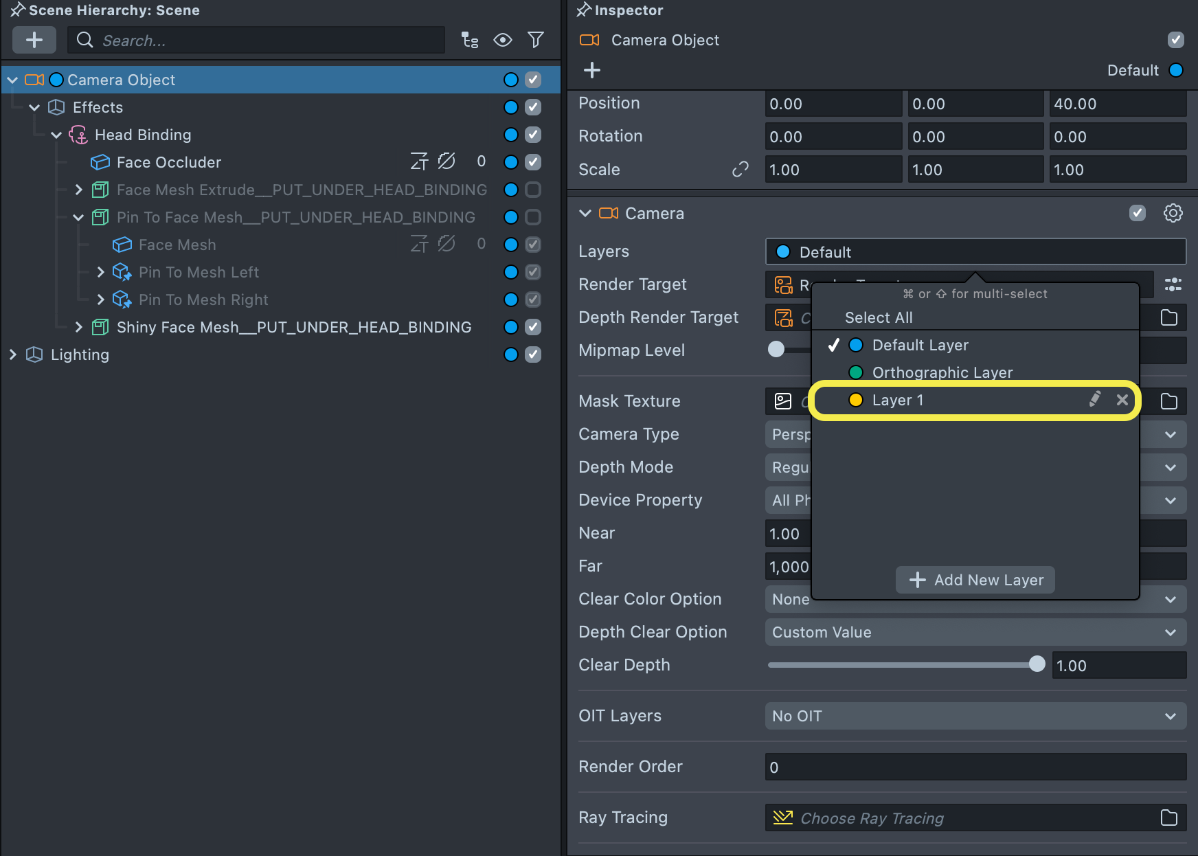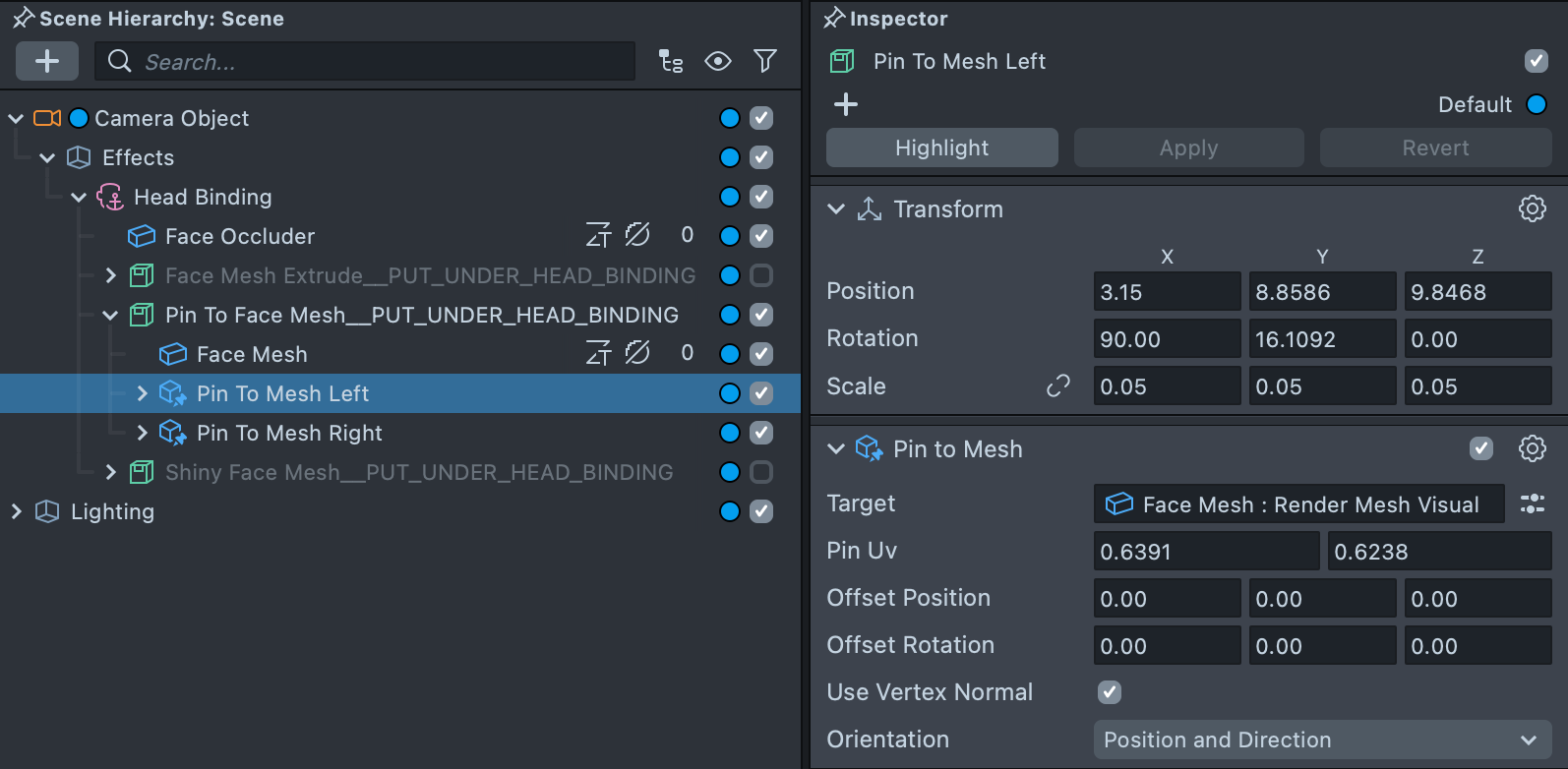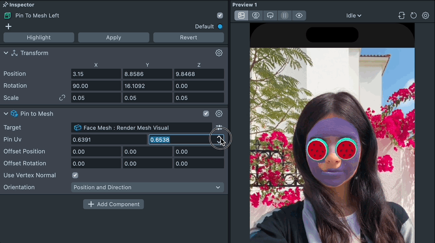 The Pin To Mesh example demonstrates how you can use the Pin To Mesh component to attach any object on to Face Mesh object which will react to the user’s facial movement.