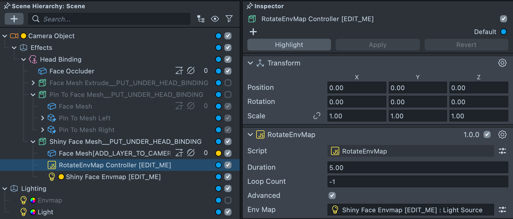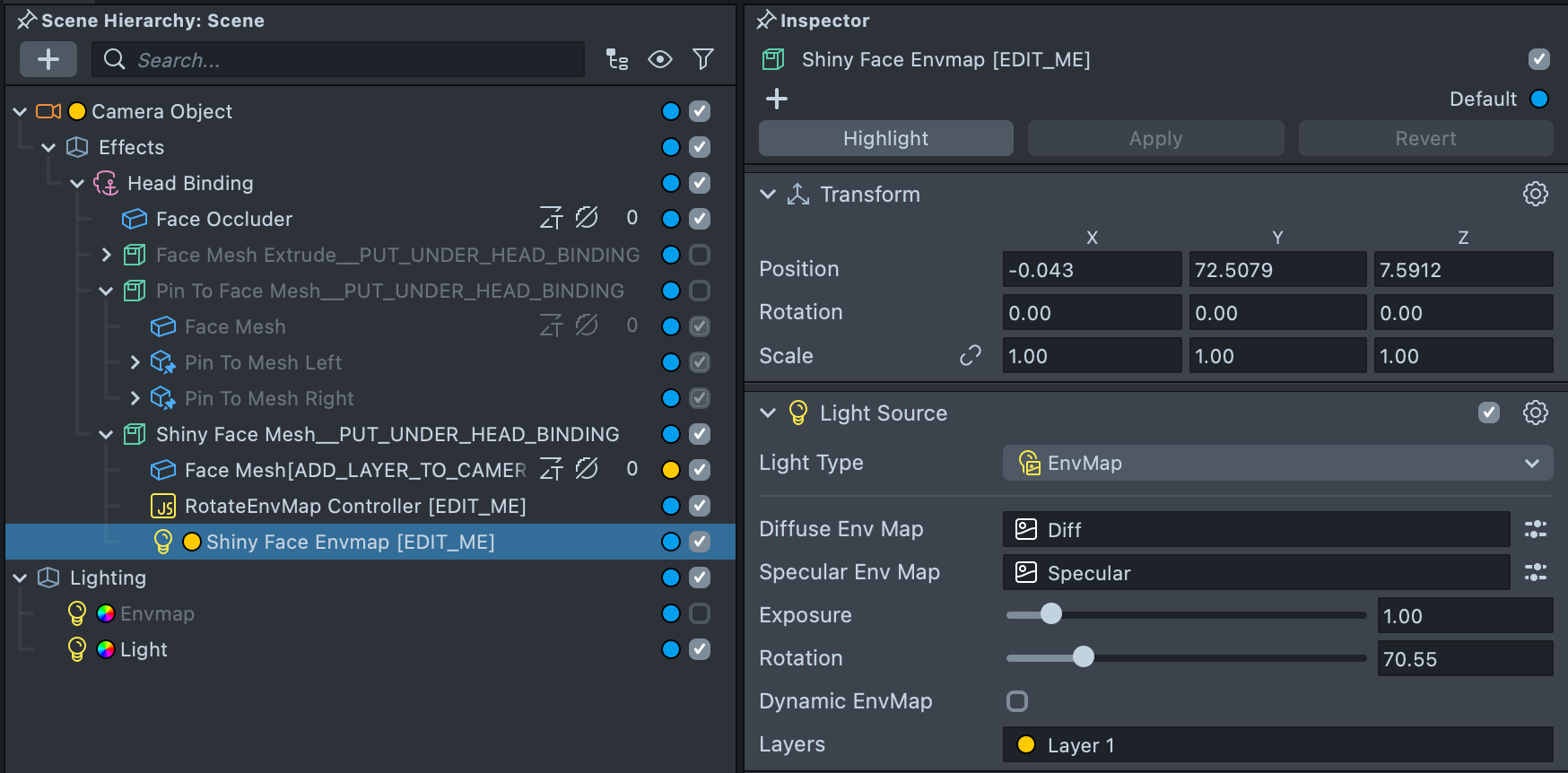 Take a look at the Lights and Shadow guide on the Lens Studio website to learn more about reflections and environment maps.