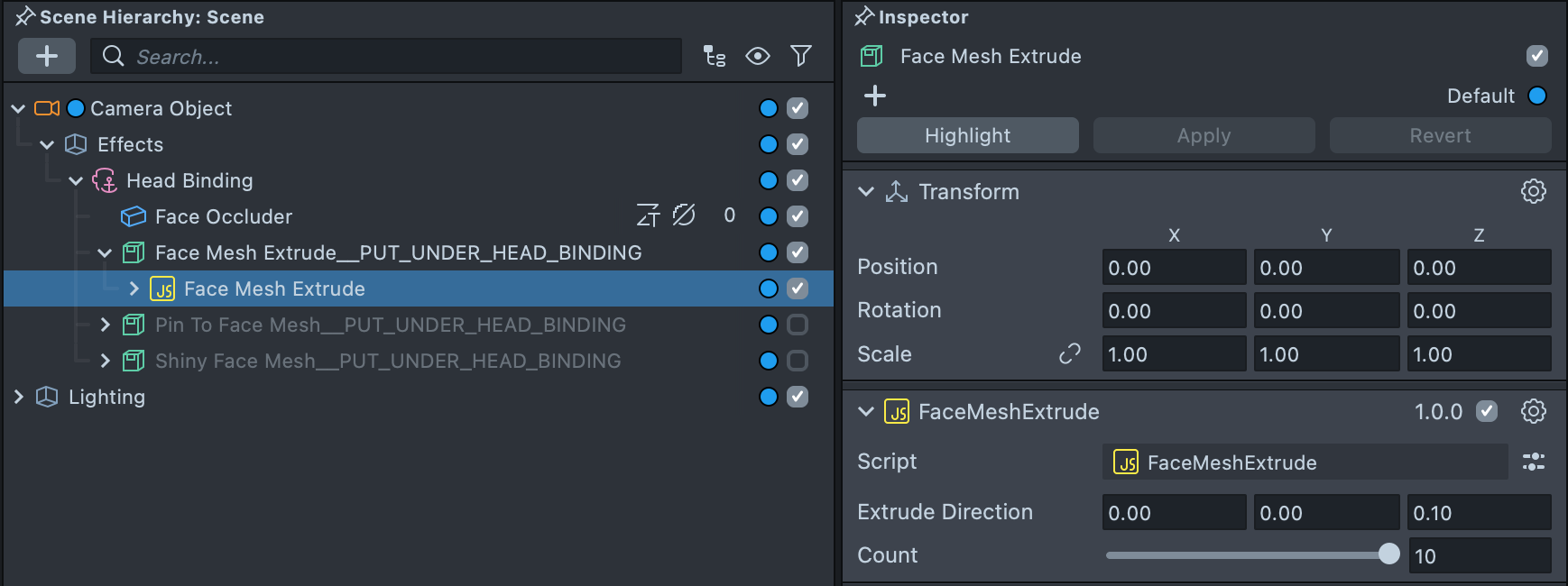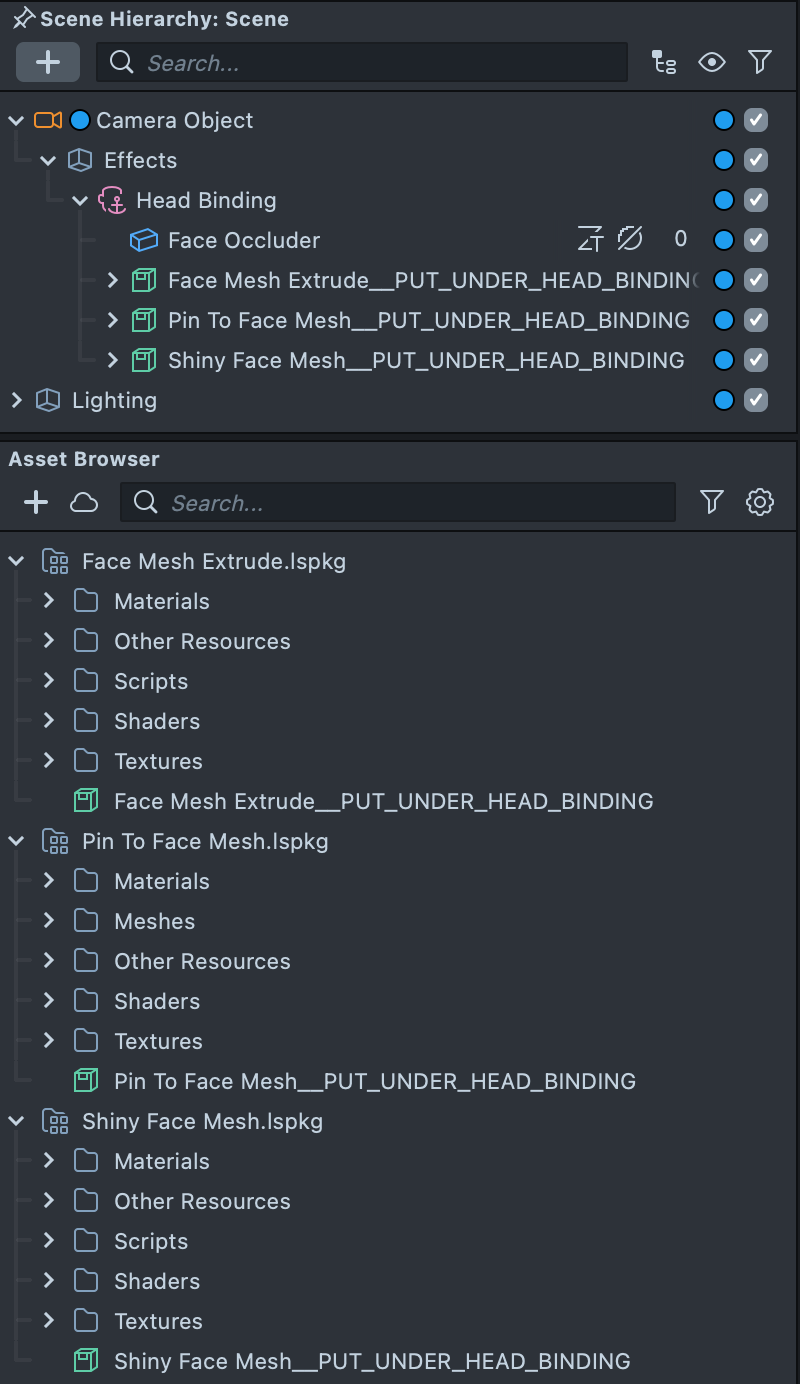 Find the Shiny Face Mesh, Pin to Face Mesh, and Face Mesh Extrude assets in the Asset Library and import it into your project. Click here to learn more about how to use assets in the Asset Library. Once you import the asset from Asset Library, you can find the package in the Asset Browser. Follow the instructions. In the Scene Hierarchy panel, + -> Head Binding and drag the prefab with PUT_UNDER_HEAD_BINDING tag into Scene Hierarchy under Head Binding to create a new Scene Object. You can right-click and select Unpack for Editing from the drop-down menu to unpack all assets stored in the bundle. Click here to learn more about Asset Packages. Once you unpack the package, you can then edit its content.