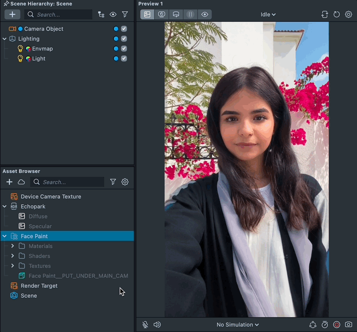 The Face Paint lets you create a Face Lens that maps a 2D texture to your face. The texture appears to be painted on your skin and reshapes with facial movements. This template is great for creating full face masks or to apply realistic makeup effects. Additionally, the guide includes a Photoshop template for guided painting on the face.