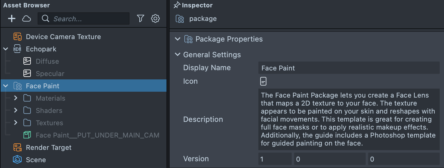 With your texture imported, find the Face Paint Template Source object in the Scene Hierarchy panel. Underneath are multiple Face Mask effect objects that correspond to the available Artboards in the Photoshop template (Eye, Lips and Full). Duplicate the one that corresponds to the texture you created by selecting it in the Scene Hierarchy panel, right clicking and selecting Duplicate. Next, select your new object and in the Inspector panel, set the Texture field to your imported texture.