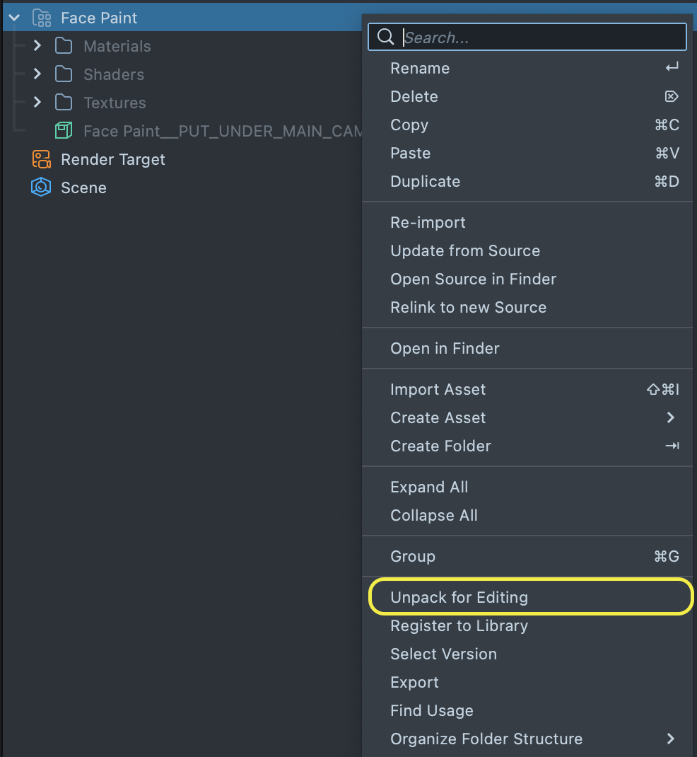 You can right-click and select Unpack for Editing from the drop-down menu to unpack all assets stored in the bundle. Click here to learn more about Asset Packages. Once you unpack the package, you can then edit its content.
