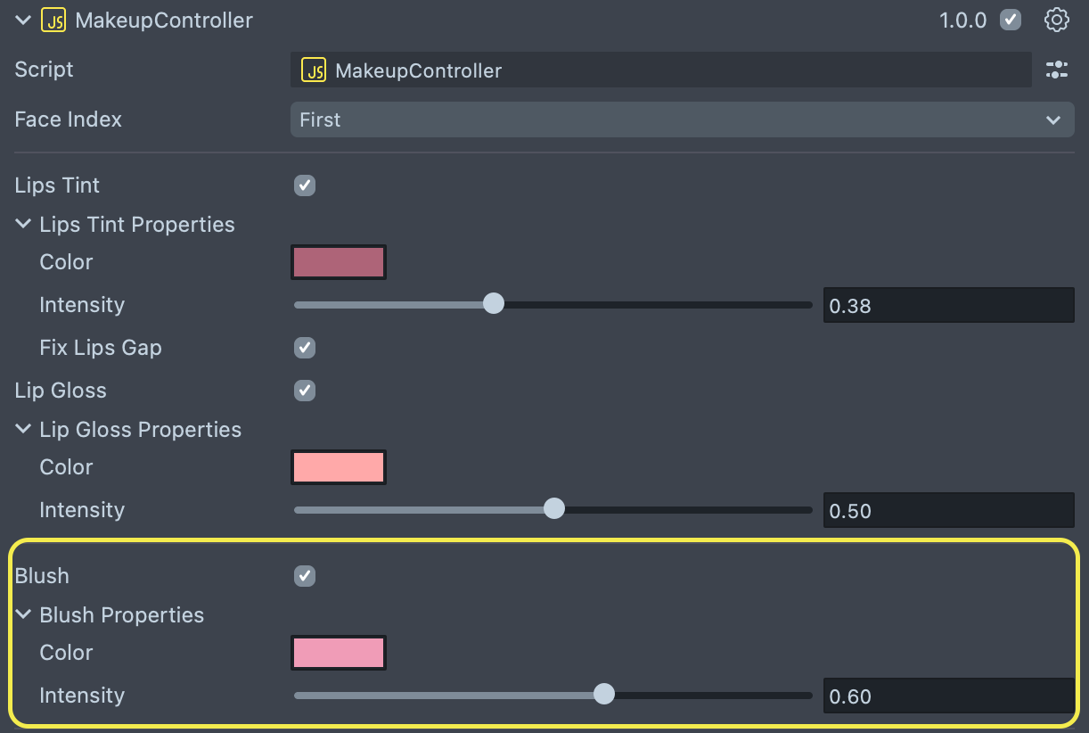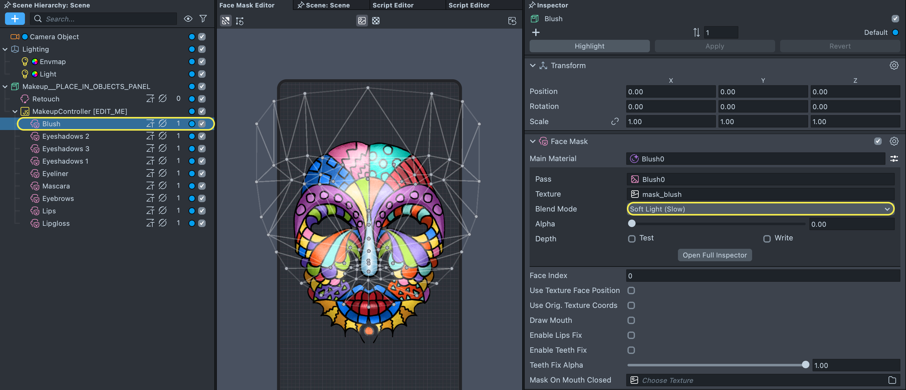 Similarly, you can change the blend mode used to apply the blush. First select the Blush face mask object in Scene Hierarchy panel. Then find its Blend Mode property in Inspector.