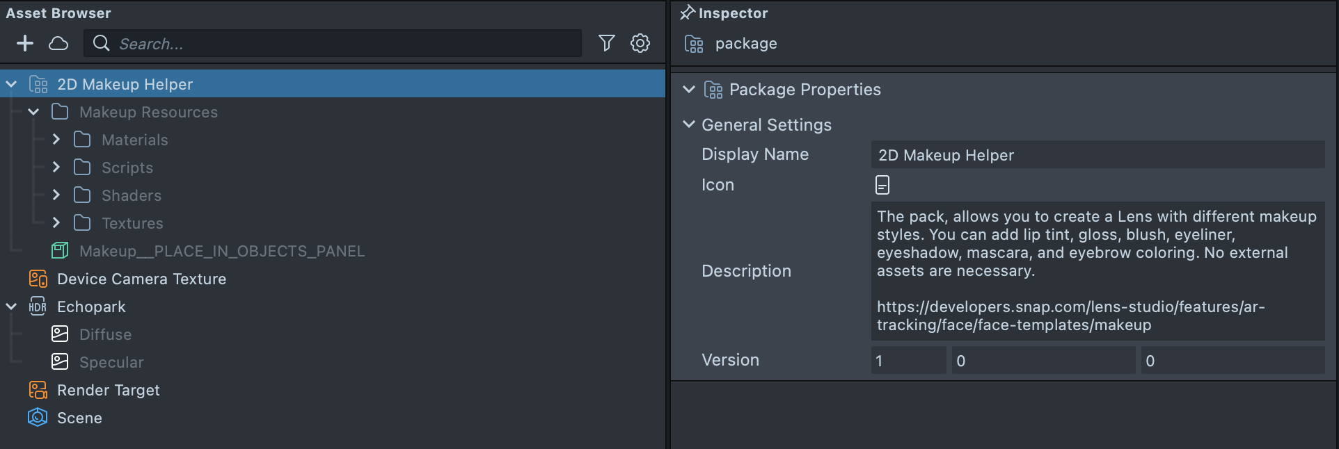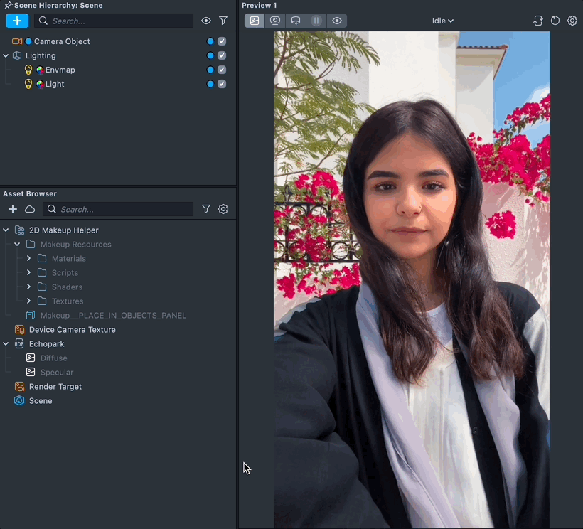 The 2D Makeup Helper Asset allows you to create a Lens with different makeup styles. You can add lip tint and gloss, blush, eyeliner, eyeshadow, mascara, and eyebrow coloring. No external assets are necessary.
