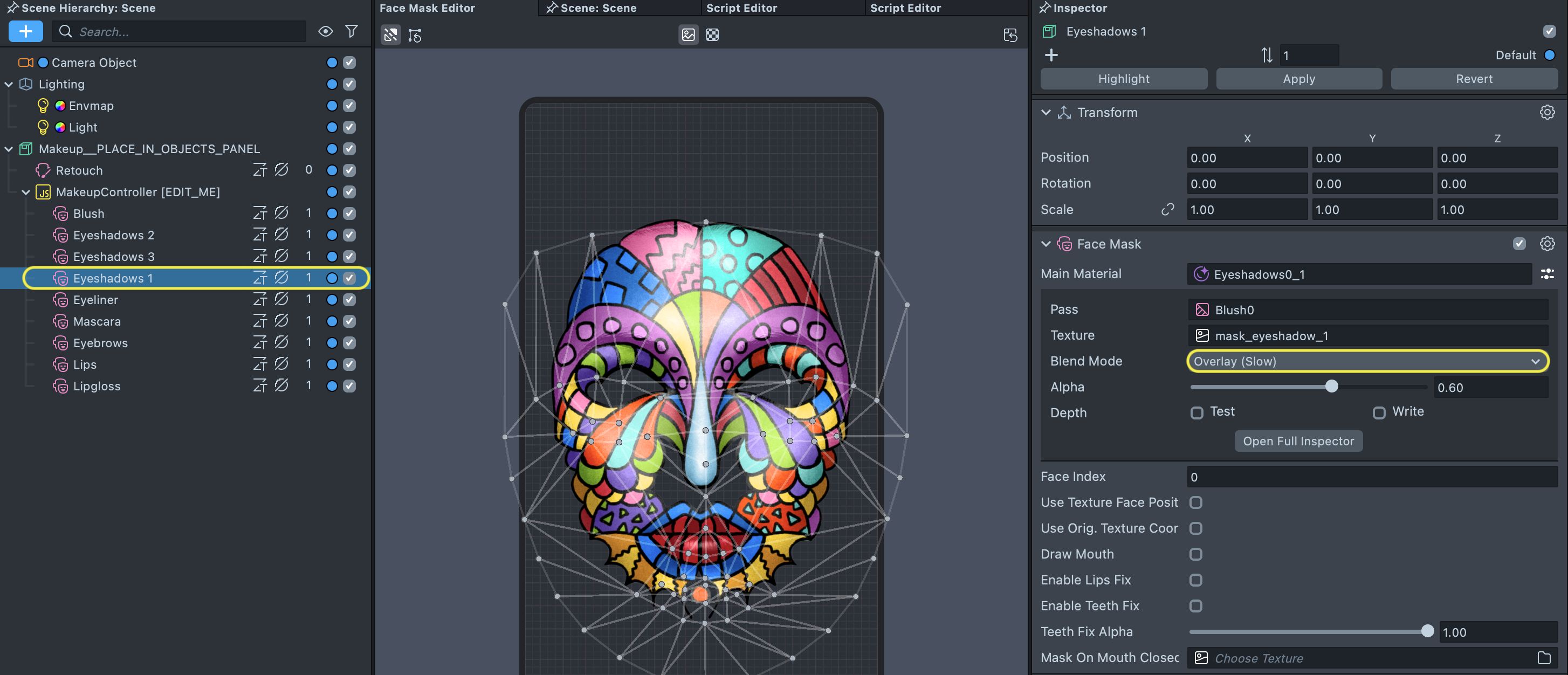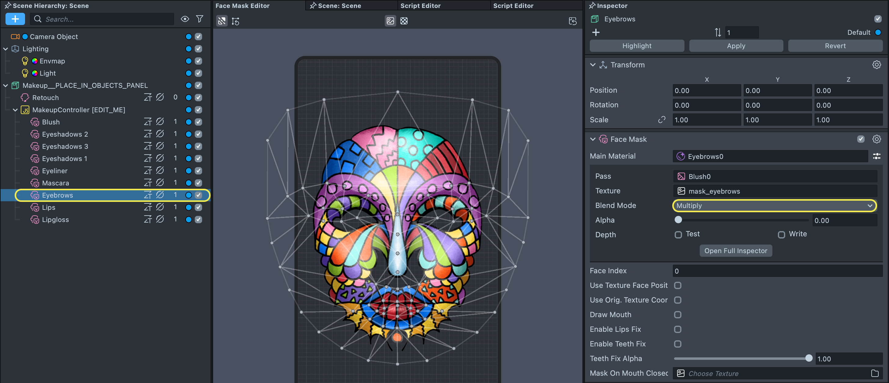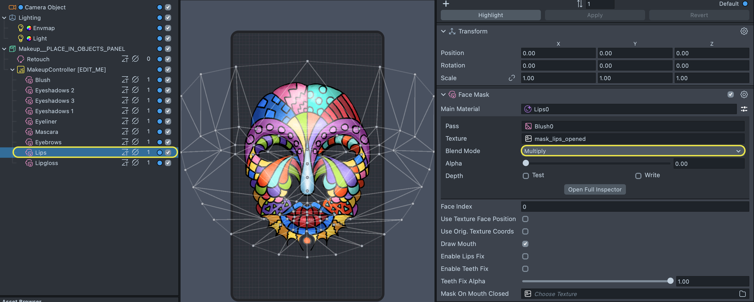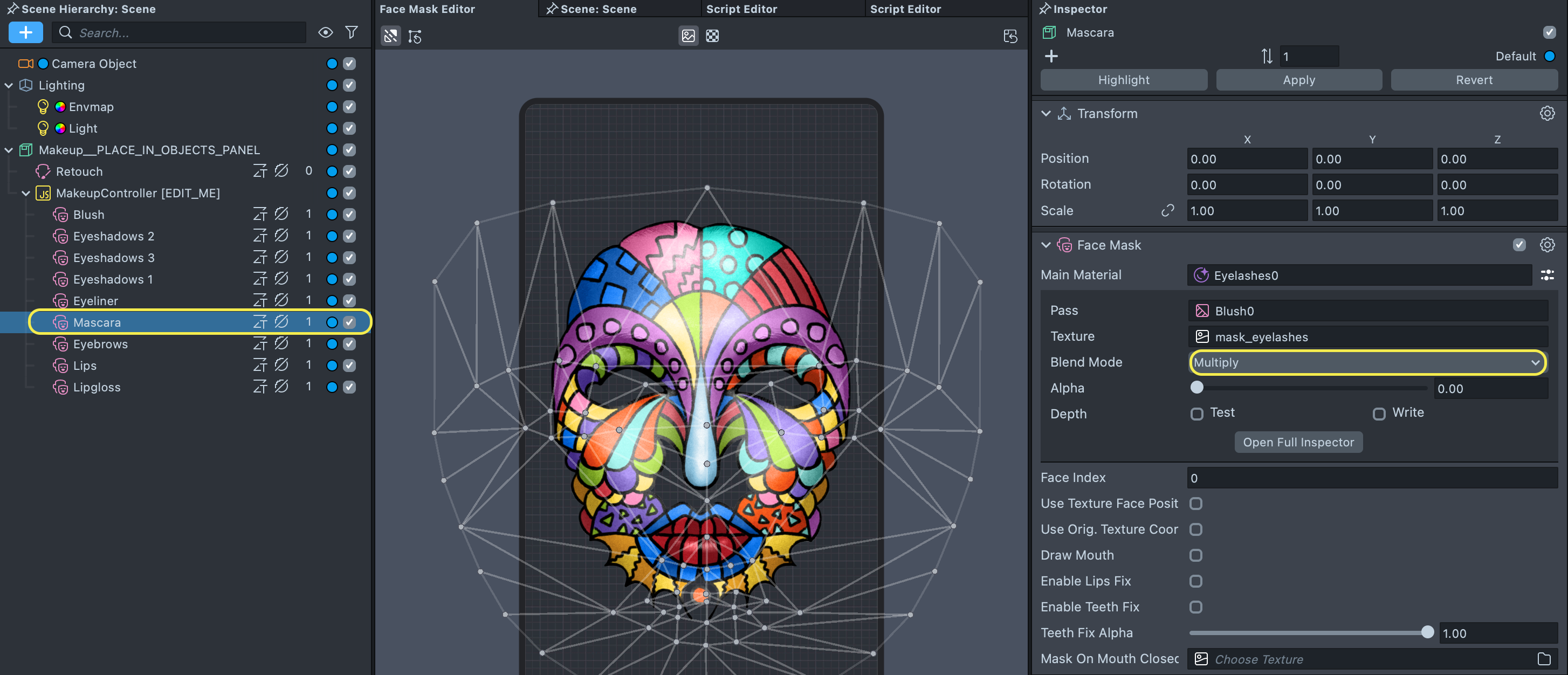 To change the blend mode select Mascara face mask object in Scene Hierarchy panel. Find its Blend Mode property in the Inspector panel. As with the eyeliner effect, try experimenting with different ones!