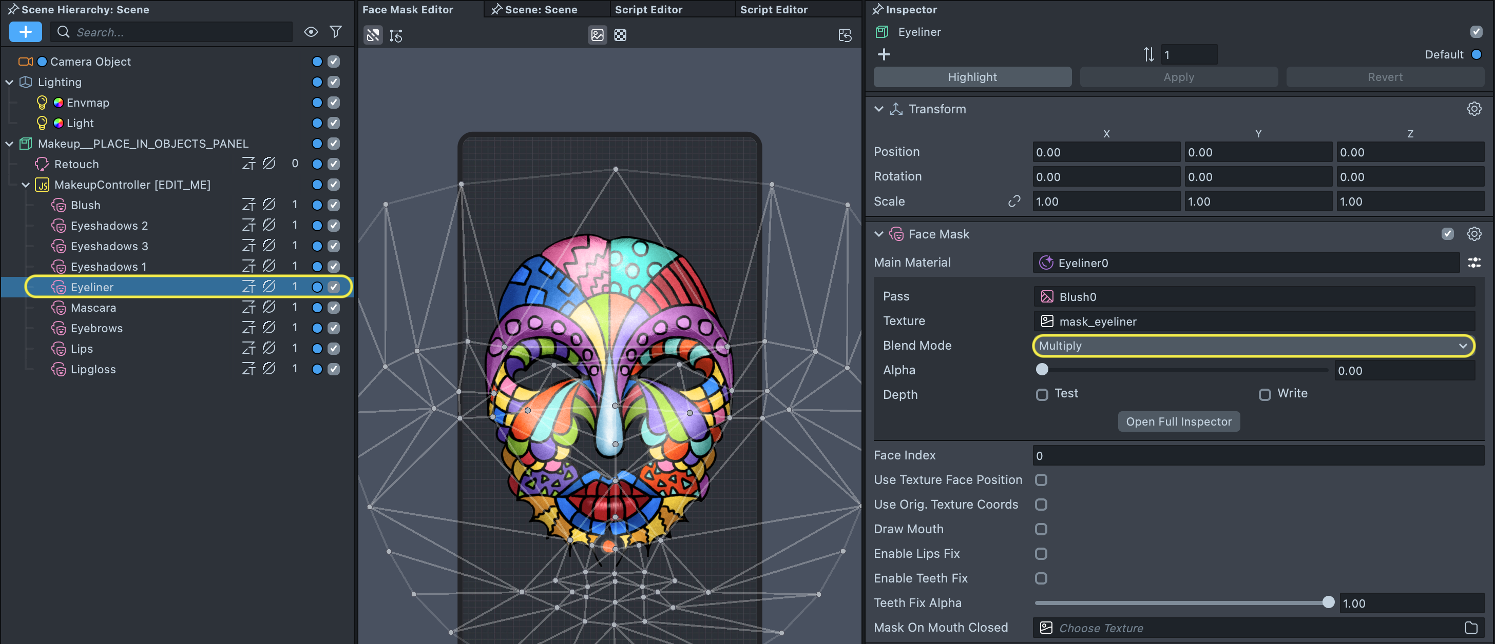 To change the effects blend mode, select the Eyeliner face mask object in Scene Hierarchy panel. Find its Blend Mode property in Inspector.